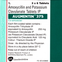 You can buy Amoxicillin and Clavulanate Potassium tablets online from Everest Online Pharmacy at a cheap price. Augmentin 375 mg, 625 mg and 1000 mg pills, manufactured by GlaxoSmithkline, India are supplied in a blister strip of 10 tablets. The 375 mg tablets cost only $1 per unit when you place an order for 300 tablets.