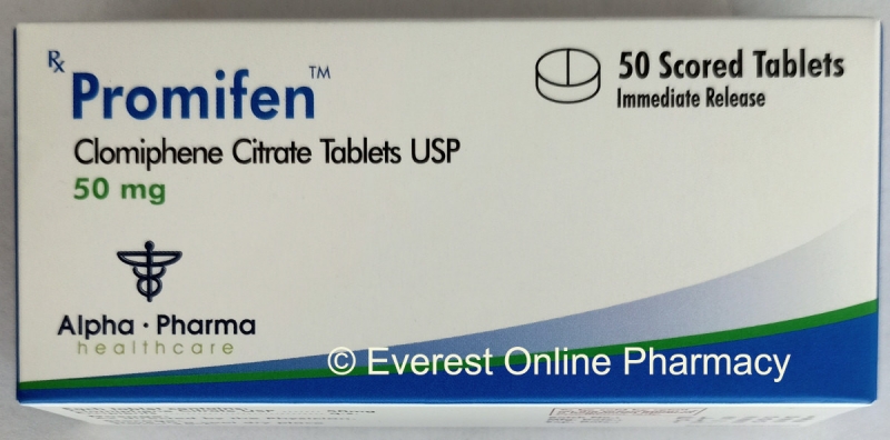 You can buy Generic Clomiphene Citrate tablets online from Everest Online Pharmacy at a cheap price. Promifen 50 mg pills, manufactured by Alpha-Pharma Healthcare Pvt. Ltd., India, are supplied in a blister strip of 10 tablets. The 50 mg tablets cost only $0.32 per unit when you place an order for 2000 tablets.