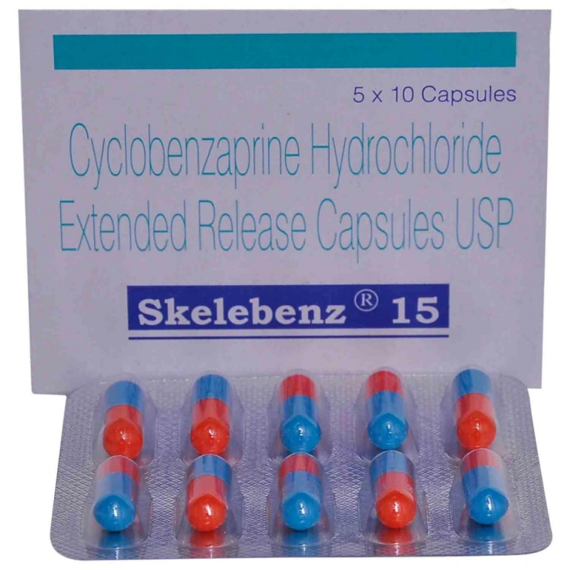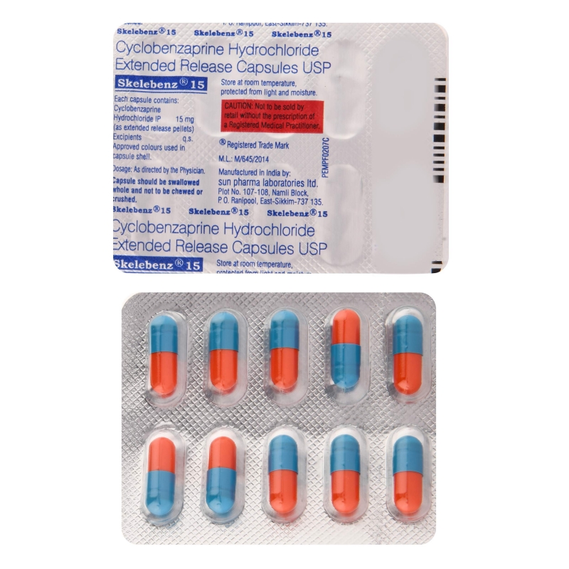 Skelebenz capsules, also known as Cyclobenzaprine Generic are used as muscle relaxants to treat skeletal muscle disorders characterized by pain or injury. Skelebenz capsules contain Cyclobenzaprine HCl as the active ingredient. Cyclobenzaprine capsules help to ease the muscle spasm that occur in specific parts of the body. Cyclobenzaprine capsules (Skelebenz) are prescribed as oral therapy for the treatment of pain related to acute musculoskeletal disorders. Cyclobenzaprine capsules effectively treat the musculoskeletal conditions by inhibiting the nerve impulses that signal the sensation of pain that are relayed to the brain. Cyclobenzaprine capsules alleviate the musculoskeletal pain without disturbing the normal muscular functions. In our online pharmacy, Skelebenz capsules are available in the strength of 15 mg of Cyclobenzaprine HCl.