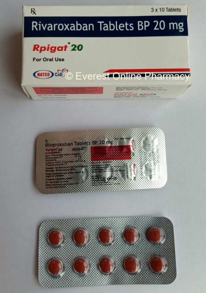 You can buy Generic Rivaroxaban tablets online from Everest Online Pharmacy at a cheap price. Rpigat 15 mg and 20 mg pills, manufactured by Natco Pharma Limited, India are supplied in a blister strip of 10 tablets. Rpigat 20mg tablets cost only USD 0.71 per tablet when you order 360 tablets. Rpigat 15mg tablets cost only USD 0.60 per tablet when you place an order for 360 tablets.