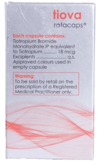 Tiova Rotacaps, manufactured by Cipla Pvt. Ltd. in the strength of 18 mcg, are used for the treatment and prevention of COPD (chronic obstructive pulmonary disease) and related breathing ailments such as bronchitis and emphysema.