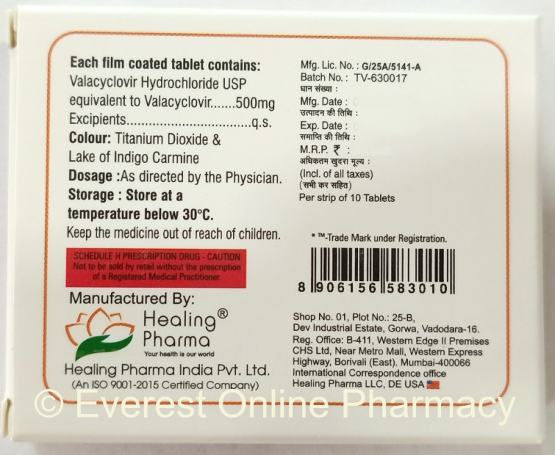 You can buy Generic Valacyclovir Hydrochloride tablets online from Everest Online Pharmacy at a cheap price. Valclovir 500 mg and 1000 mg pills, manufactured by Healing Pharma India Private Limited, are supplied in a blister strip of 10 tablets. The 500 mg pills are priced at only $1.05 per unit if you place an order for 200 tablets.