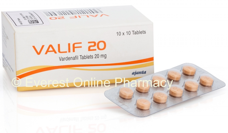 You can buy Generic Vardenafil Tablets online from Everest Online Pharmacy at a cheap price. Valif 20 mg and 10 mg pills, manufactured by Ajanta Pharma Limited, India are supplied in a blister strip of 10 tablets. The 20 mg tablets cost only $0.86 per unit when you place an order for 500 tablets.