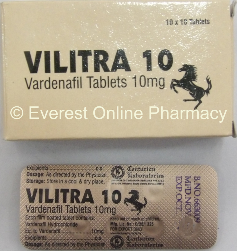 You can buy Vardenafil Hydrochloride Tablets online from Everest Online Pharmacy at a cheap price. Vilitra 20 mg and 10 mg pills, manufactured by Centurion Remedies Limited, India are supplied in a blister strip of 10 tablets. The 10 mg tablets cost only $0.79 per unit when you place an order for 300 tablets.